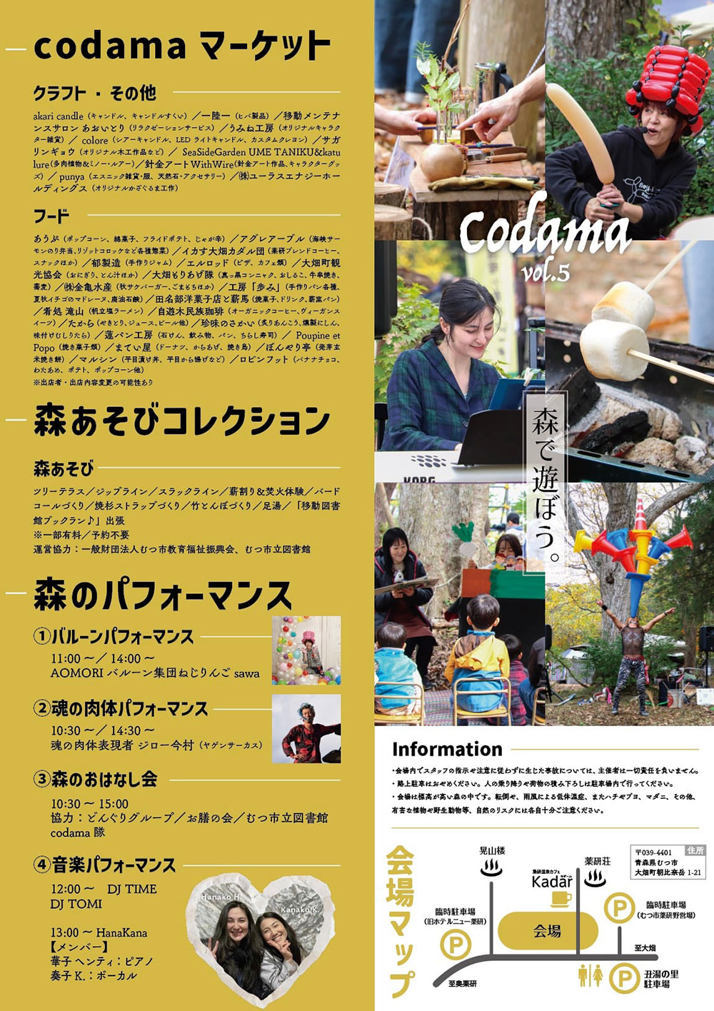 ツリーテラス/ジップライン/スラックライン/薪割り&焚火体験/バードコールづくり/焼杉ストラップづくり/竹とんぼづくり/足湯/「移動図書館ブックラン♪」出張